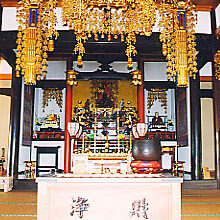 今の本堂は昭和58年に建立。本堂内陣の丸柱は、神代欅を使用。数千年、土の中に埋もれていた欅の丸柱が、神々しい光を放っている。